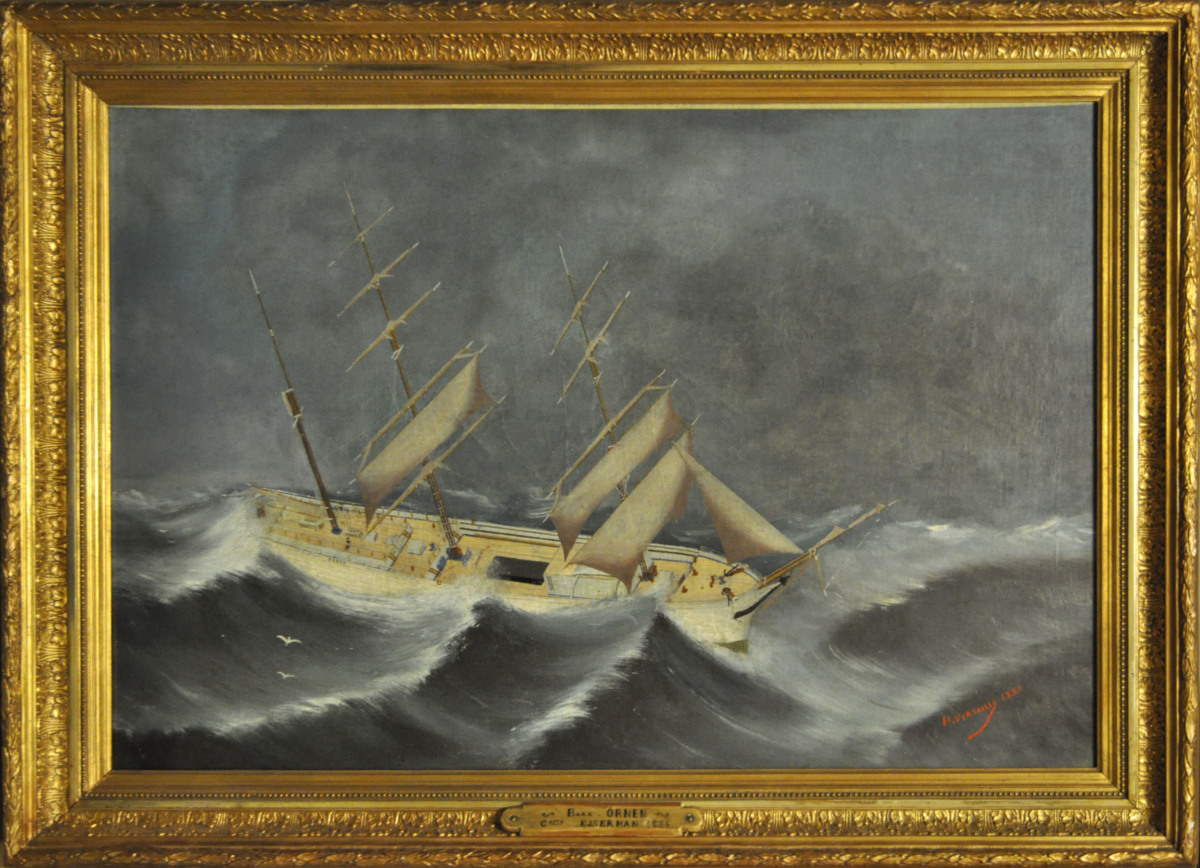 Föreställande skeppet Örnen i storm. Örnen byggdes 1877 på Kustens varv i Göteborg. Ägdes fram till 1891 av J.F. Strömberg (Rederi AB Örnen.) Såldes 1893 till Norge. Örnen var ett mycket känt fartyg i Göteborg.