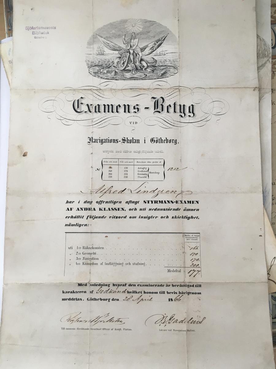 Betyg för Alfred Lindgren över avlagd styrmansexamen av andra klassen vid Navigationsskolan i Göteborg. Daterat i Göteborg 28 april 1866.
