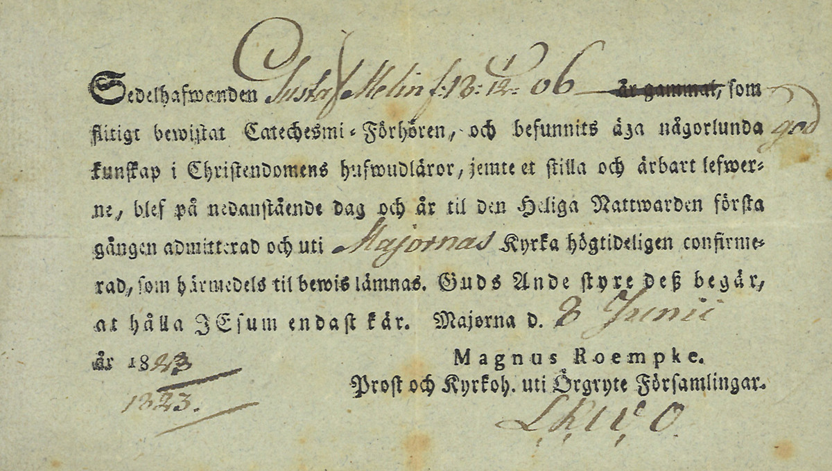 Konfirmationsbevis utfärdat av prosten Magnus Roempke, Örgryte Församlingar, Majorna, 8 juni 1823.