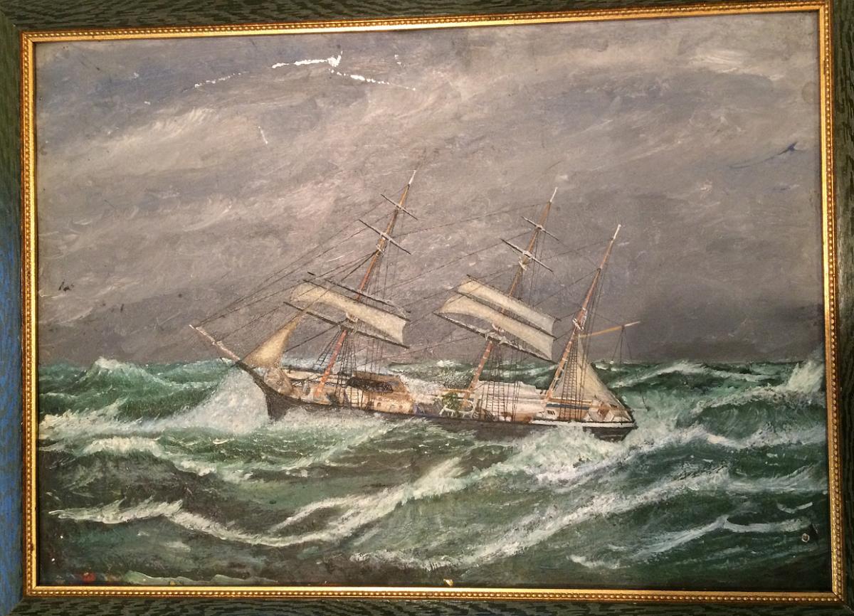 Föreställer barken GLADAN i början av 1880-talet, då förd av kapten Carl Lundberg. Målningen utförd av samme kapten Lundberg under en resa Valparaiso-Europa i början av 1880-talet