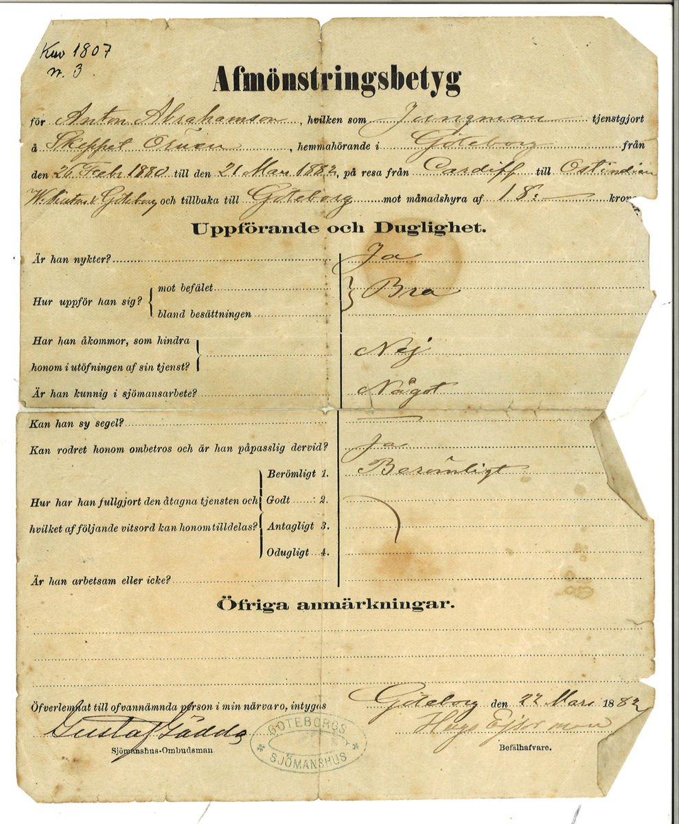 Gå tillbaka till sökPublic DomainLägg till i Min samlingKopiera länkSkriv utAfmönstringsbetygÖRNEN, 1877, tremastad barkAktörerHugo Eiserman (1834 - 1912), Brukare Anton Abrahamsson (1862 - 1943), BrukareKategoribetyg (Dokument, handlingar, personliga handlingar)FartygÖRNEN, 1877, tremastad barkDatering1882Material och teknikpapper, tryck, handskriftDimensionerGrundmått 21,50 x 17,50 cmInventarienummerSMG6284UtställdInte utställd på museet