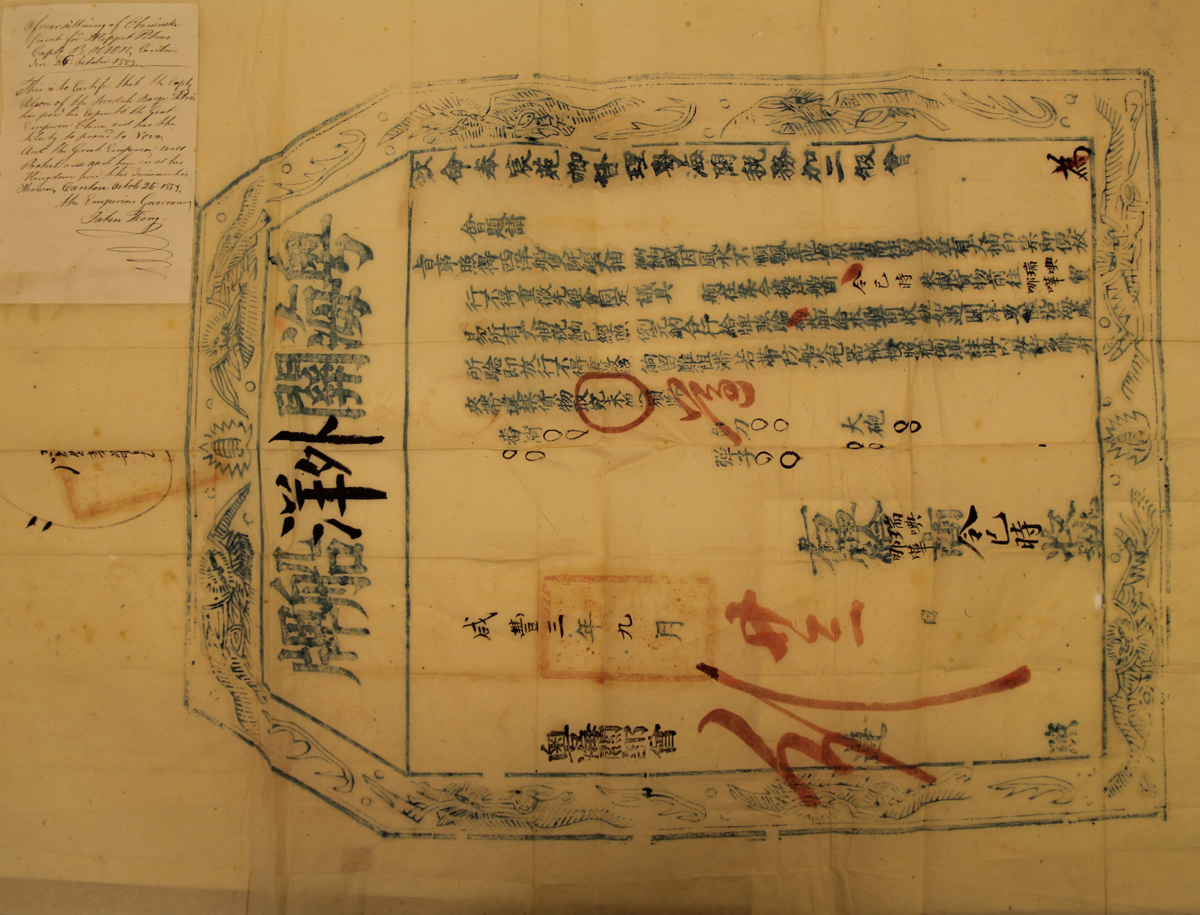 Handmålat kinesiskt pass i svart, blått och rött på gulnat rispapper. Utfärdat i Kanton, Kina, 26 oktober 1853 på sjökapten Benjamin Olson, som kapten på barken PETRUS.