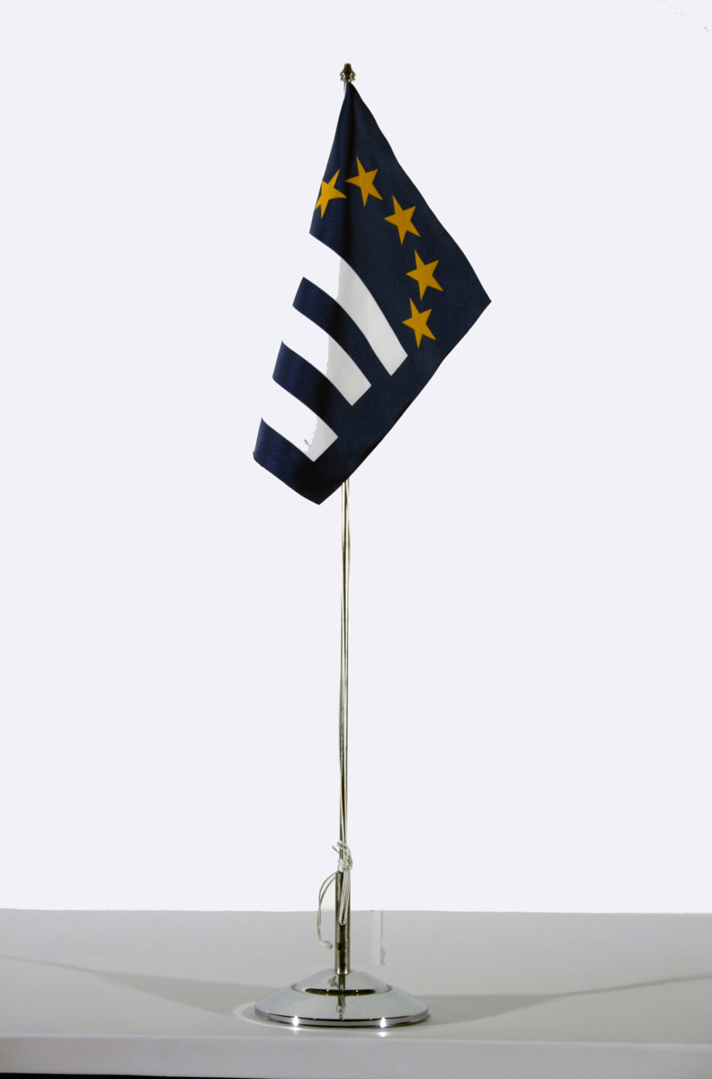 Stång av förnicklad metall. Stången är rund med en tjockare del nedtill som står på en rund platta av pressad plåt.