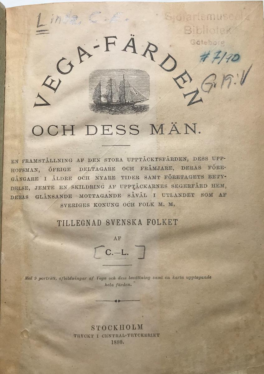 'En framställning af den stora upptäcktsfärden, dess upphofsman, öfrige deltagare och främjare, deras föregångare i äldre och nyare tider samt företagets betydelse, jemte en skildring af upptäckarnes segerfärd hem, deras glänsande mottagande såväl i utlandet som af Sveriges konung och folk m. m. TILLEGNAD SVENSKA FOLKET Af C. - L. (C. E. Linde) Med 9 porträtt, afbildningar af Vega och dess besättning samt en karta upptagande hela färden. Stockholm Tryckt i Central-Tryckeriet 1880. Pris: 50 öre.'