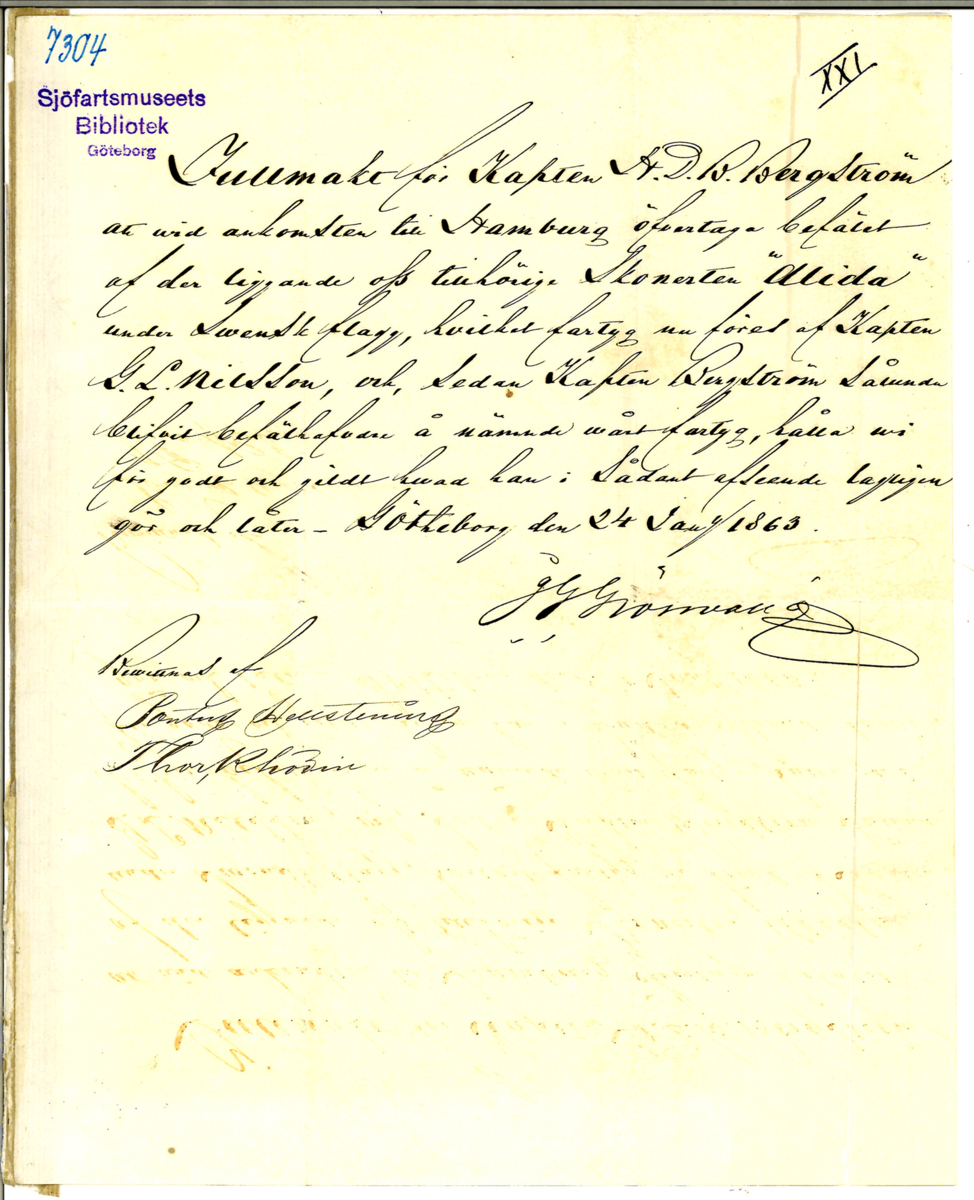 Fullmakt för Kapten H.D.B. Bergström att föra befäl på skonerten ALIDA, utfärdat av J. G. Grönwall & Co. Daterat 24 januari 1863