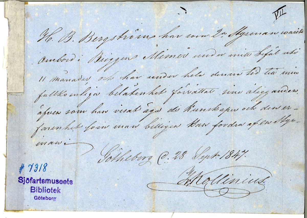 Andra styrman på briggen MIMER, daterat 28/9 1847