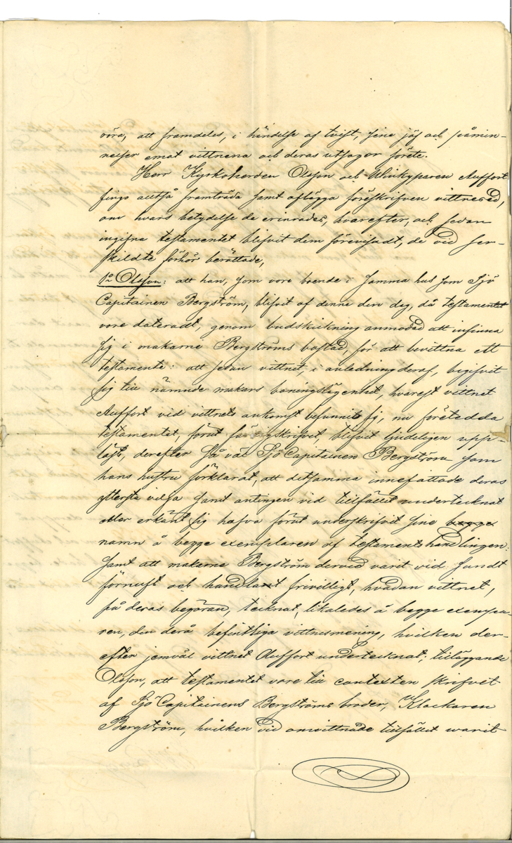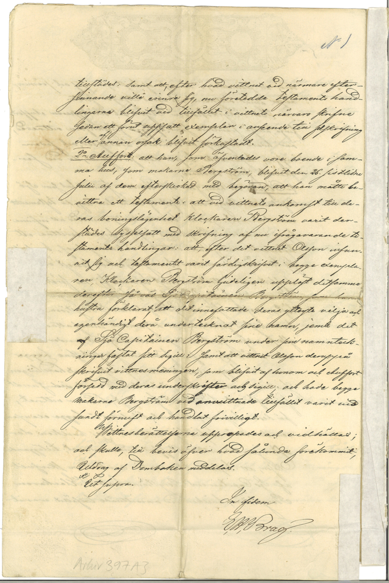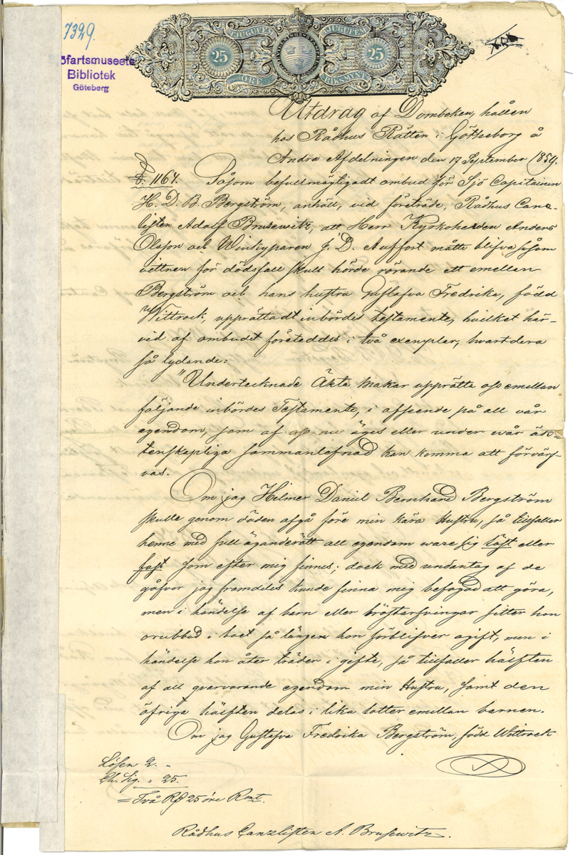 Utdrag ur domboken hållen hos Rådhusrätten i Göteborg, gällande kapten Hilmer Bergström och hans makas testamente. Daterat 17 september 1859