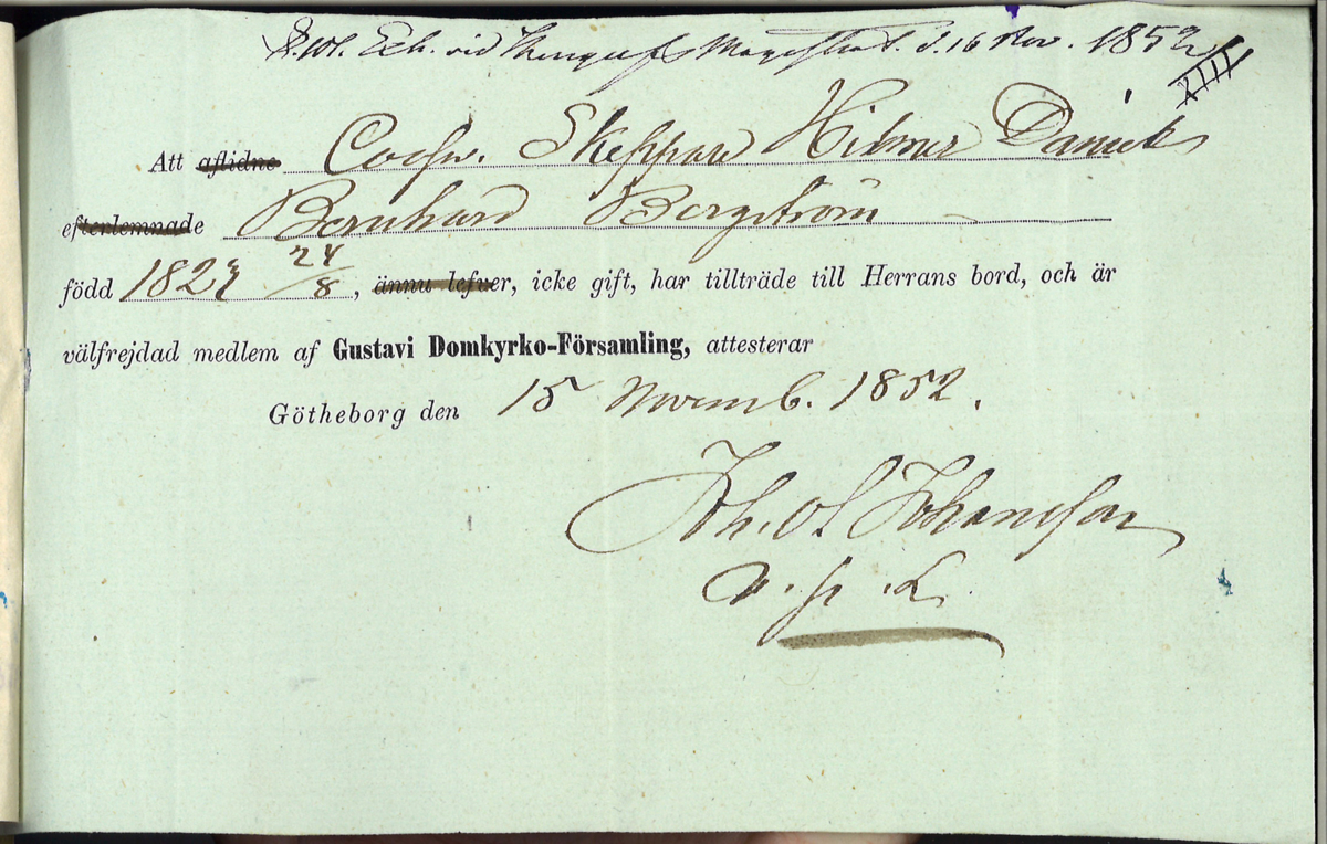Intyg för Coopw. Skepparen H.D.B. Bergström, att han icke är gift. Utfärdat av Gustavi Domkyrka församling 15 november 1852