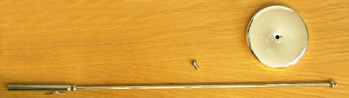 Stång av förnicklat järn med tjockare nederdel med en knap av förnicklad mässing samt upptill på stången en knopp av förnicklad mässing. Stången står på en cylindrisk fot, gjord av pressad förnicklad järnplåt.