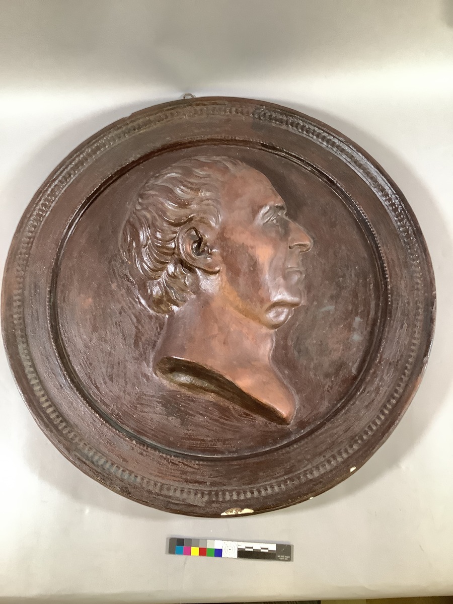 Gipsmedaljong föreställande skeppsbyggmästare Gilbert Sheldon. Troligtvis tillverkad under slutet av 1700-talet.