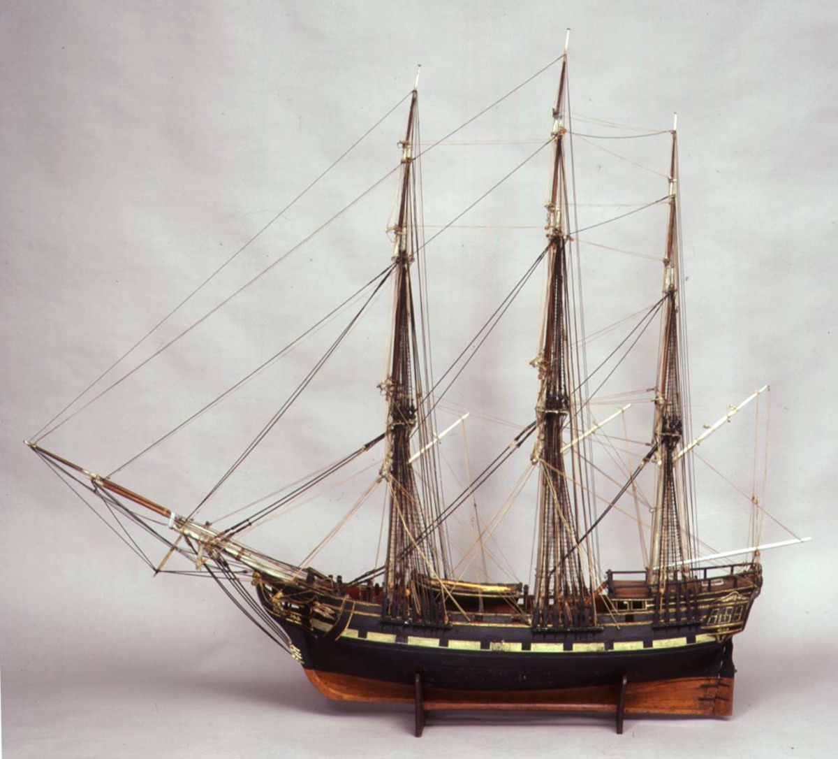 Modell av en ostindiefarare av senare typ med rår på samtliga tre master. Svart skrov med vitt bålte och svarta kanonportar, kopparfärgat undervattenskrov samt vita master. Modellen har ovanligt hög rigg.
