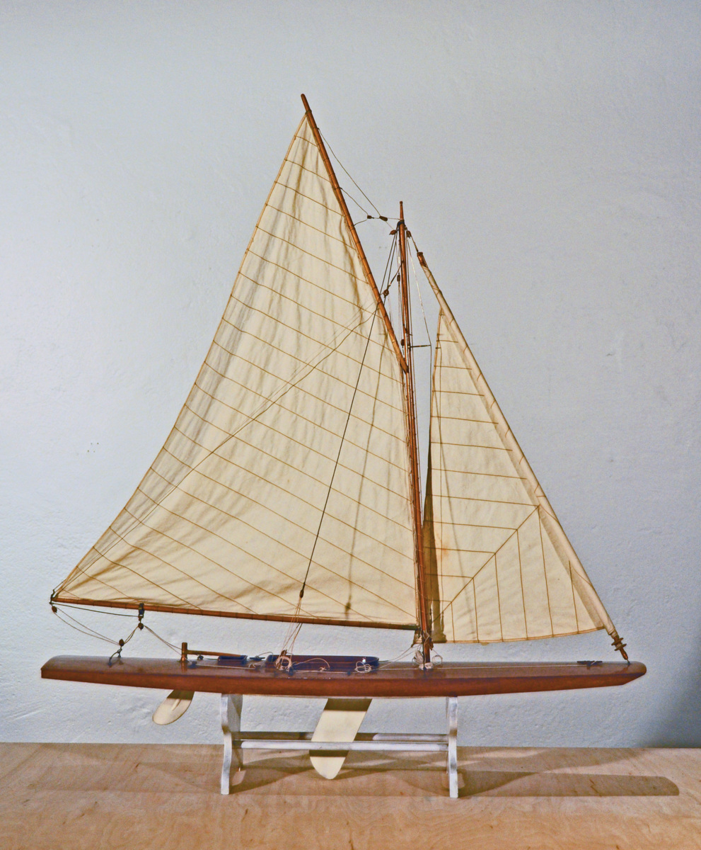 Modell med segel. Skrov flatbottnat med fena, botten vitmålad, för övrigt lackerad mahogny. Byggd för Olof Mark.