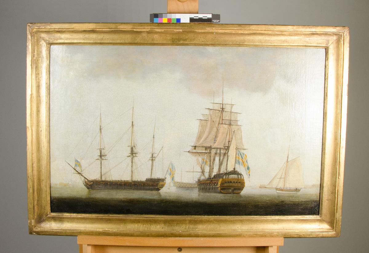 Svensk ostindiefarare till ankars på Älvsborgsfjorden, under senare delen av 1700-talet.