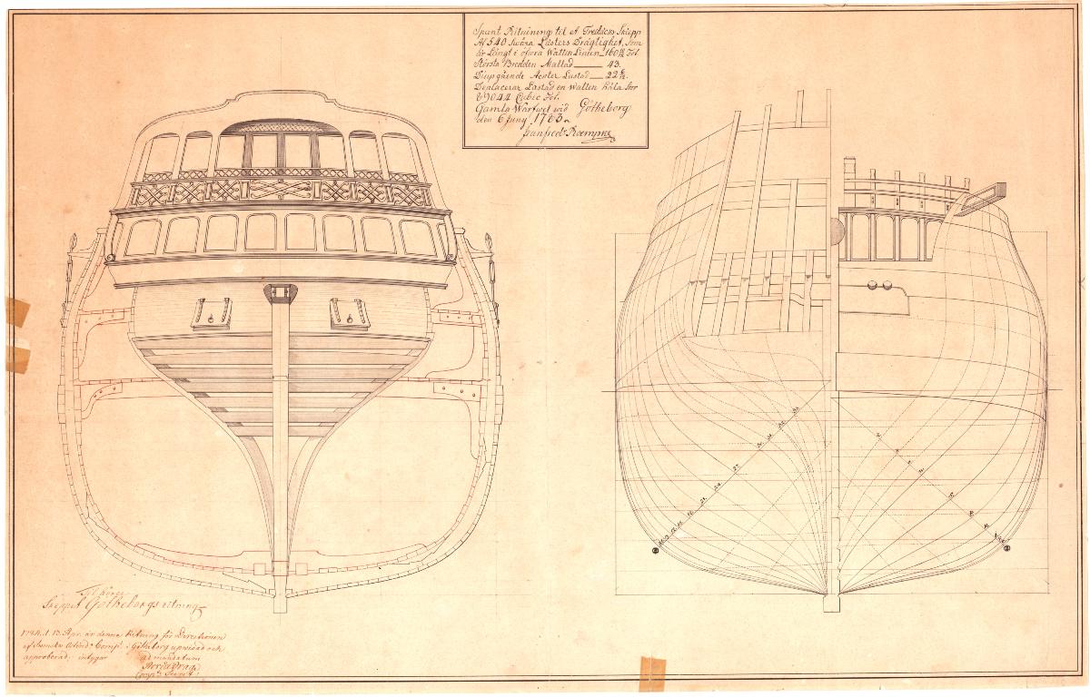 Spantritning av GÖTHEBORG II, daterad 6 juni 1783 vid Gamla Varvet, Göteborg. Fartyget konstruerades av Jean Fredrik Roempke, sannolikt i samarbete med den kända skeppsbyggaren Fredrik Henrik af Chapman (1721-1808), för Svenska Ostindiska Kompaniets fjärde oktroj.