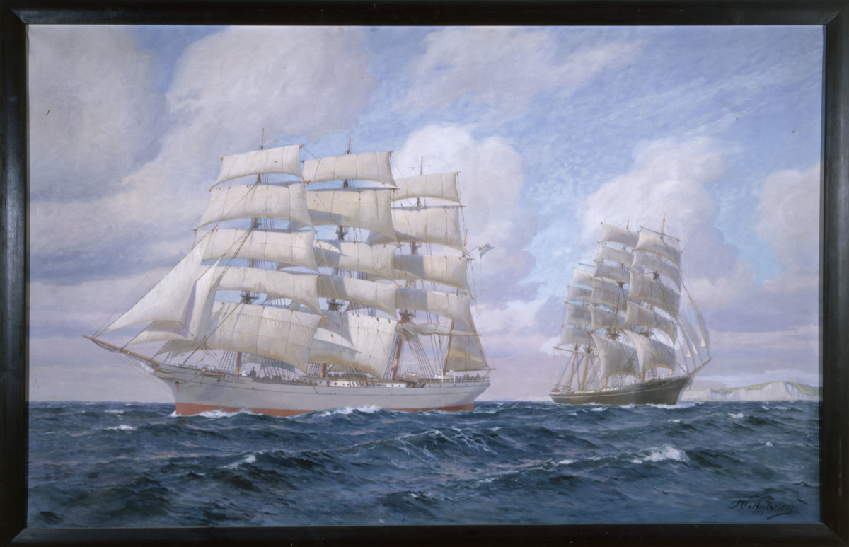 Skolfartygen ABRAHAM RYDBERG och C.B. PEDERSEN vid möte i engelska kanalen. ABRAHAM RYDBERG på utgående och C.B. PEDERSEN på hemgående.