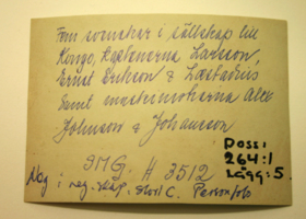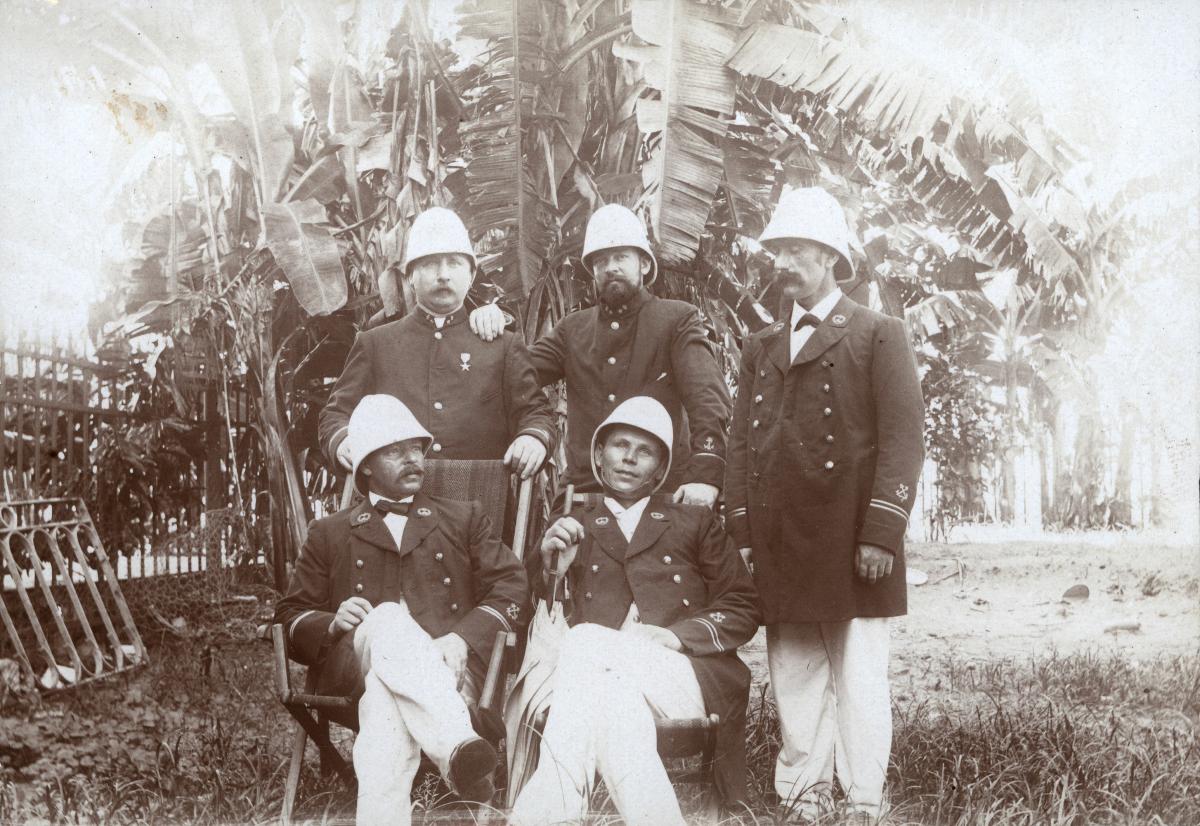 Sepiafärgat fotografi föreställande fem svenskar som avreste från Antwerpen den 6 mars 1897 till Kongo. Kaptenerna Larsson, Ernst Erikson och Lestadius samt maskinisterna Alex. Johnson och Johanson.