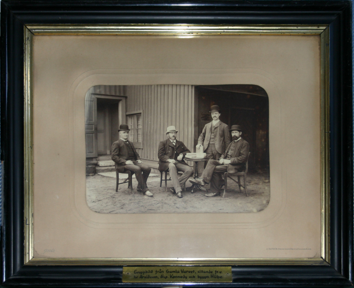 Svartvit inramad gruppbild från Gamla Varvet. Sittande fr. v. herr Arvidsson, disponent Kennedy och byggmästare Hübe.