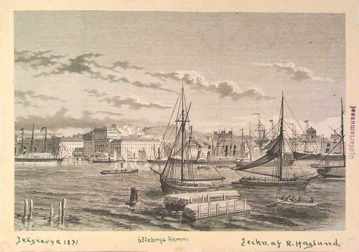 Reproduktion av gravyr, uppklistrad på en pappskiva. Text på pappskivans nedre kant; Trägravyr 1871. Göteborgs Hamn. Teckn. af R. Haglund.
