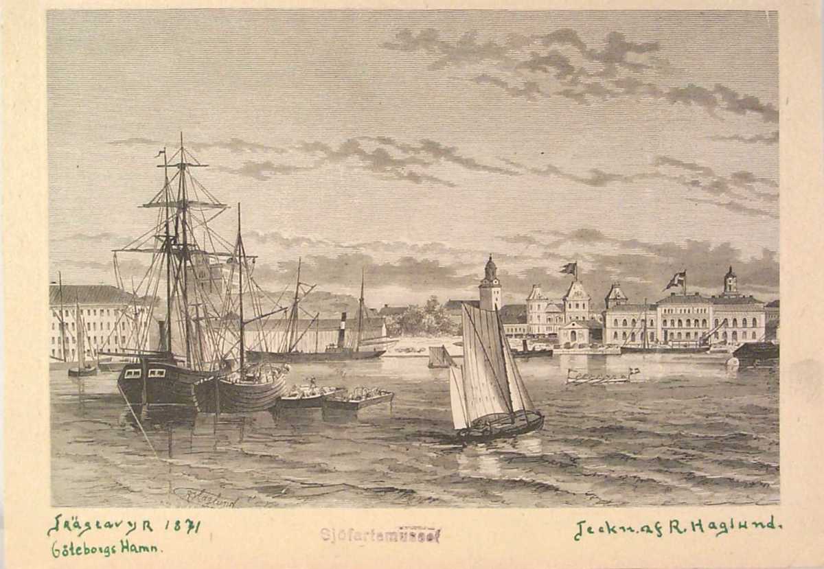 Reproduktion av grafik, uppklistrad på kartong. Text under bilden: Trägravyr 1871. Göteborgs Hamn. Teckn. Af R. Haglund.