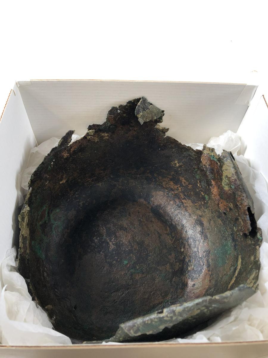 Bottendel av kärl/gryta. Kopparlegering. 160 mm diam. Bevarad höjd ca 140 mm.