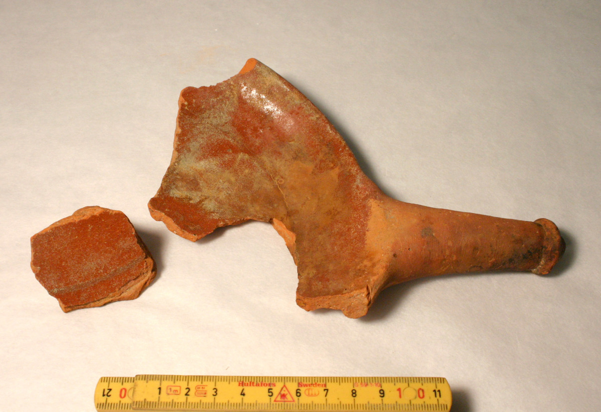 Större del av stekfat, med skaft och brätte. Löst ben. Invändig glasyr.