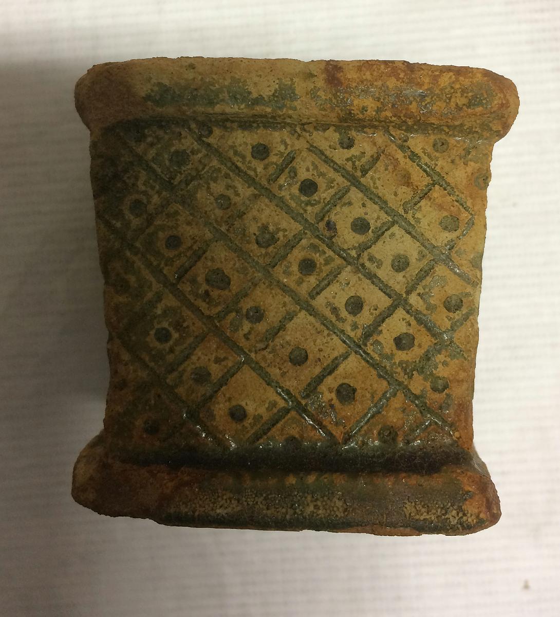 Kubisk form. Ihålig med fyra mindre hål, troligen som pennhållare. Sidorna med plastisk dekor, streck-och-punkter.