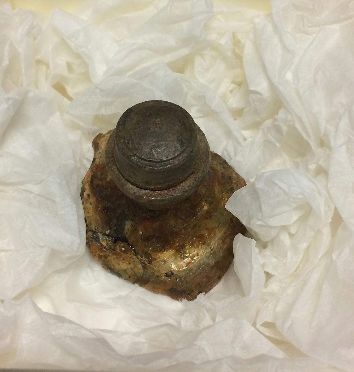 Mindre tennkork, in situ på del av flaska. Hals och del av skuldra kvar av flaskan.