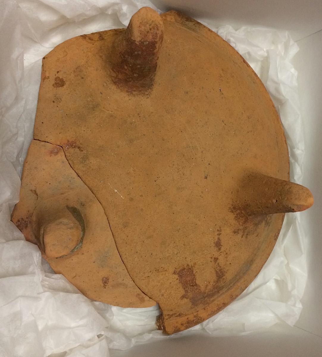 Större del av stekfat. Rörskaftet saknas. Invändig glasyr.