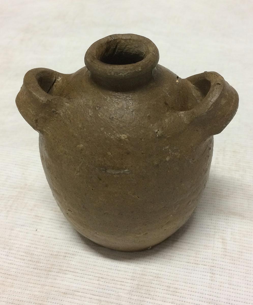 Två små horisontella hänklar. Salvekrus eller liknande funktion. Sprucken rakt igenom.