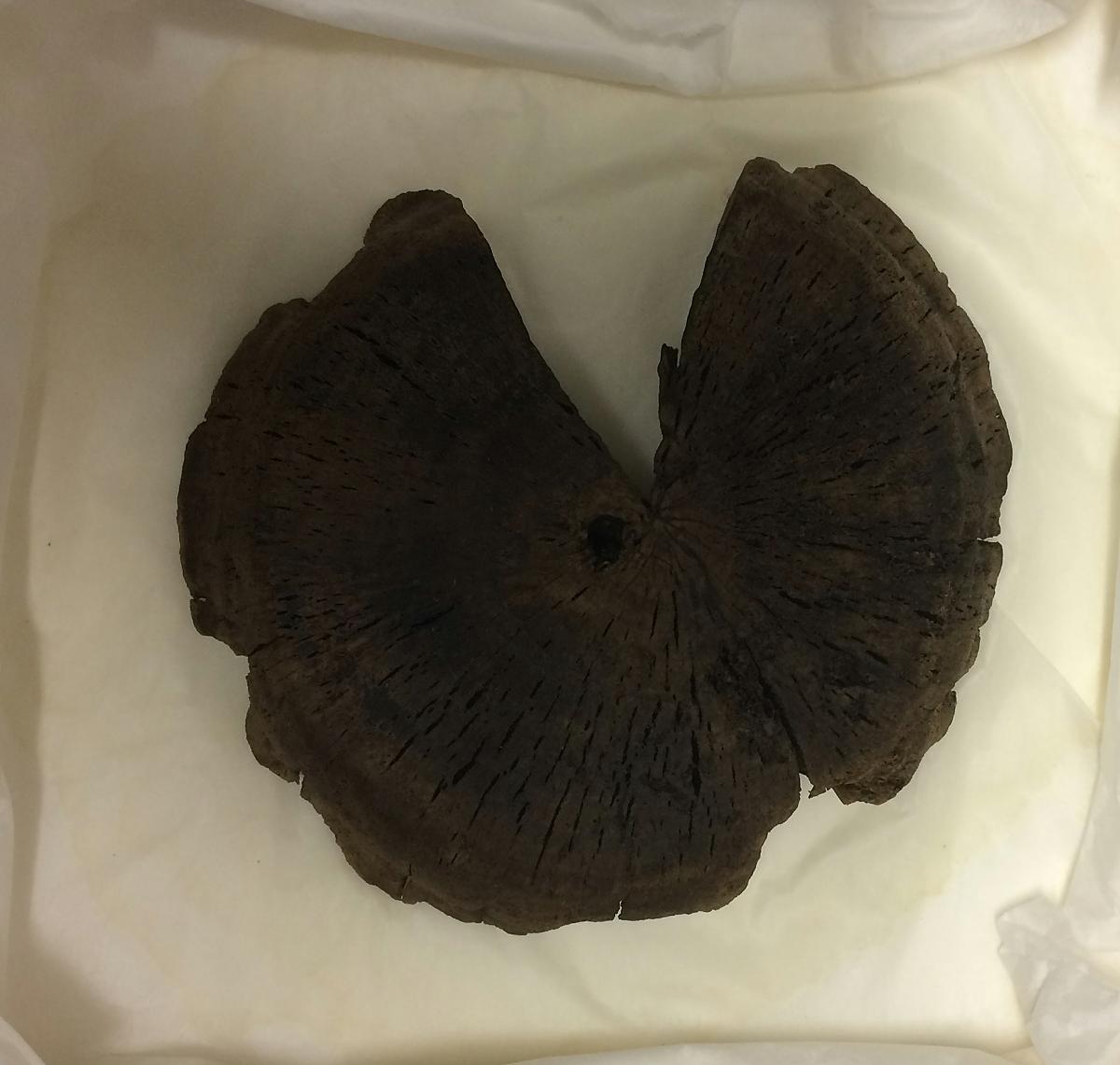 Rund svarvad platta. Litet borrat hål i mitten, efter knopp. Kan vara ett lock till förvaringskärl. Något defekt.