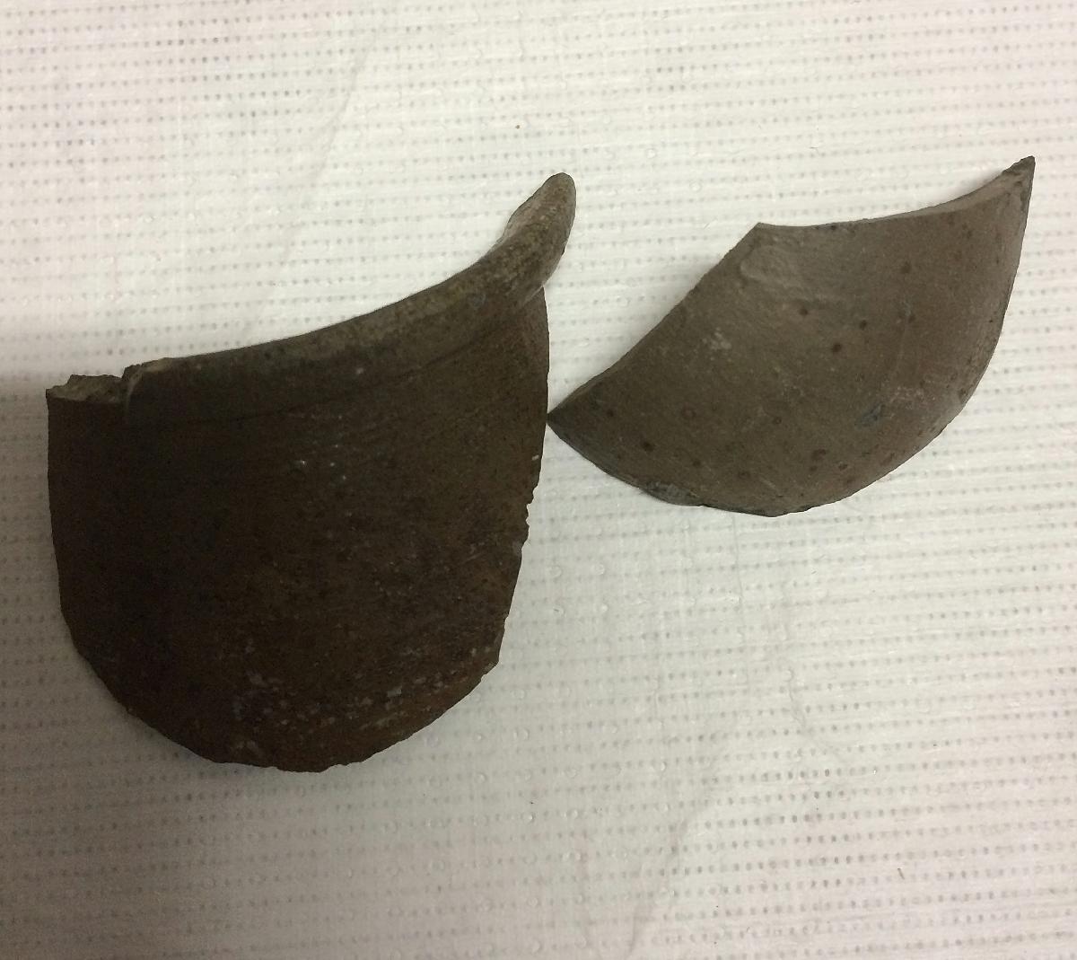 Grått gods till mindre slutet kärl, möjligen salvekrus eller liknande. En skärva med mynningsrand.