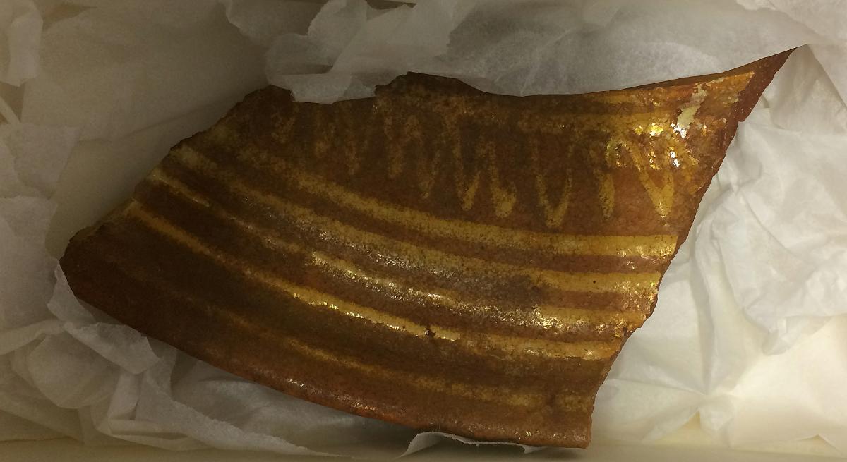 Del av brätte till fat. Hornmålad, koncentriska linjer och zig-zag. Invändig glasyr.