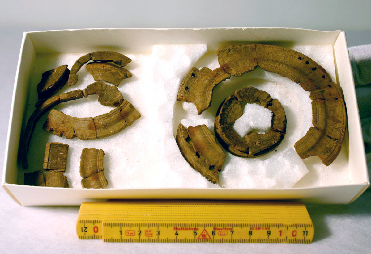 Större antal fragment till snidat/svarvat föremål, möjligen lock till kärl. Ytbeläggning, förgyllning?