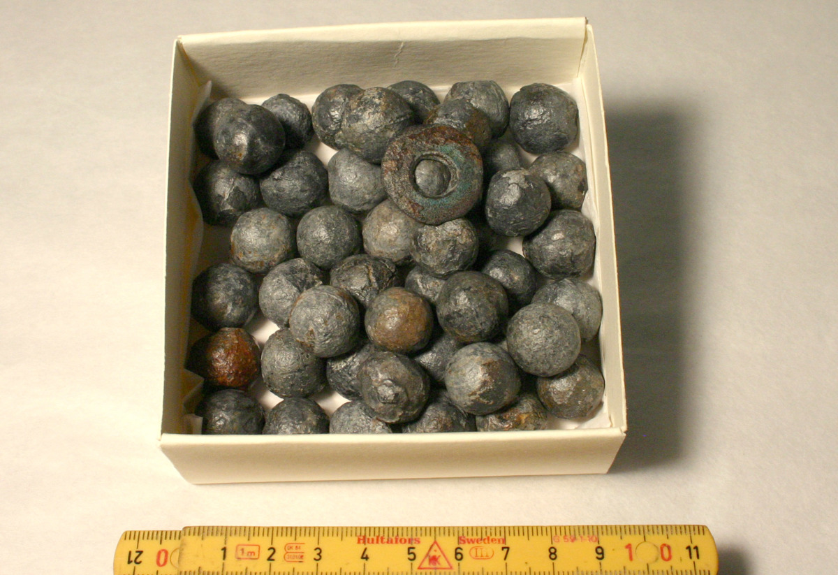 Muskötkulor, även mindre ring i bly, 25 mm diam, hålet 9 mm diam.