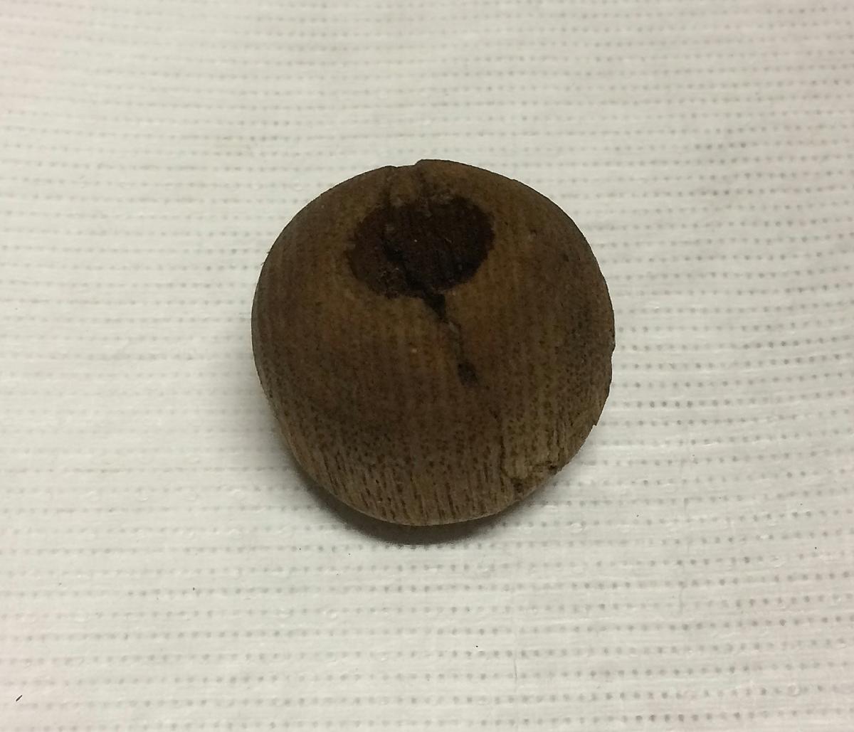 Ände av svarvad trädetalj, kula, ihålig.