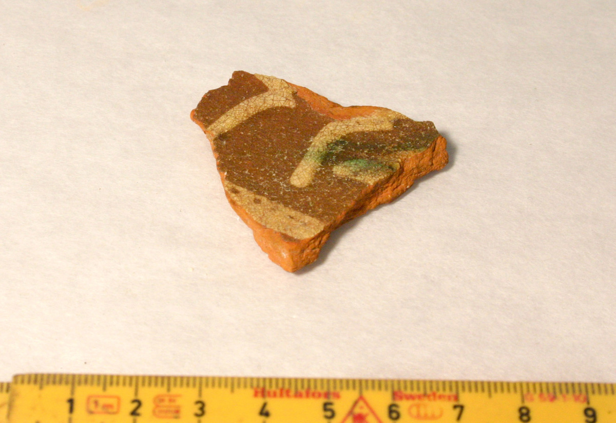 Skärva från fat, bottenspegeln. Hornmålat och punktmålat och punktvis grön glasyr.
