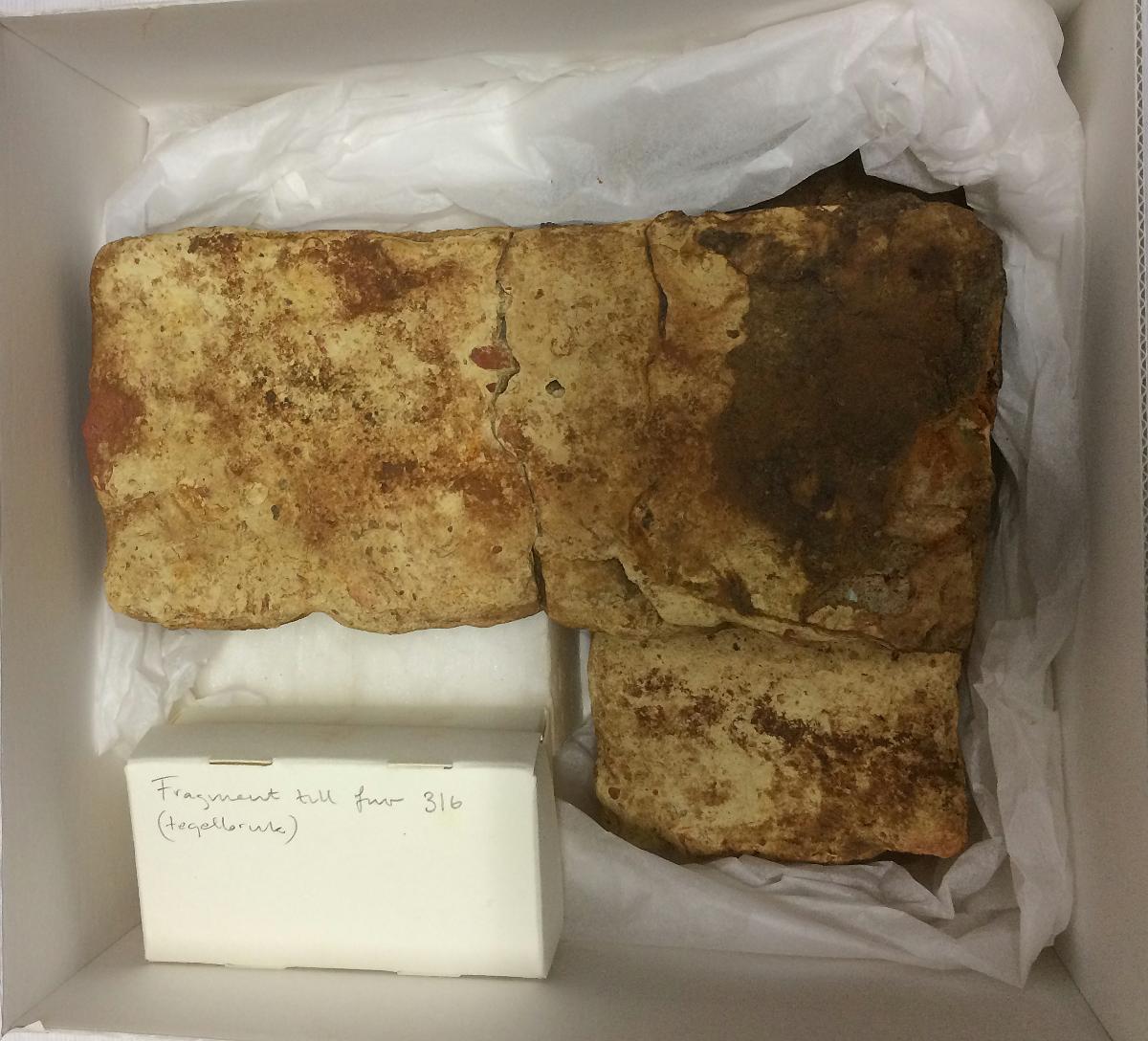 Två sammanfogade tegelstenar, ligger i rätvinkligt förband. Troligen från eldstaden i kabyssen. Puts och beläggning.