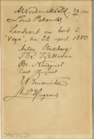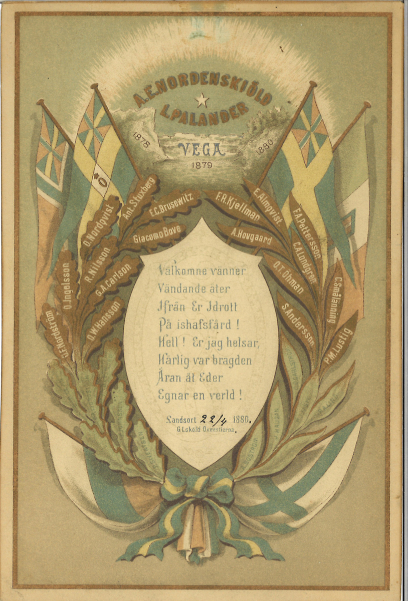Välkomstdiplom för A E Nordenskiöld och L Palander, samt besättning. Baksidan har autografer av Vegaexpeditionens ledare.