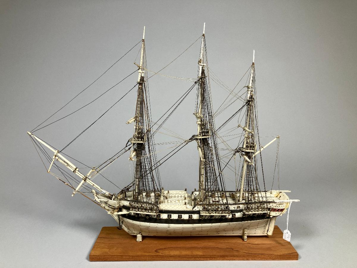 Modell av fullriggad örlogsfregatt i elfenben med beslag av silver. Tackling av tvinnat silke. Monterad på träplatta.