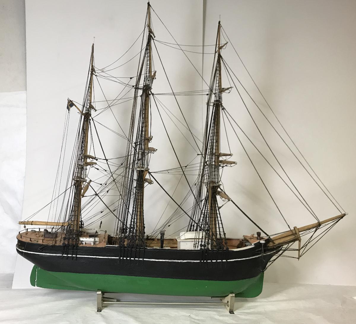 Tremastad fullriggare i trä med rigg, fockmast, stormast och kryssmast utan segel och tågvirke av lin och bomull.