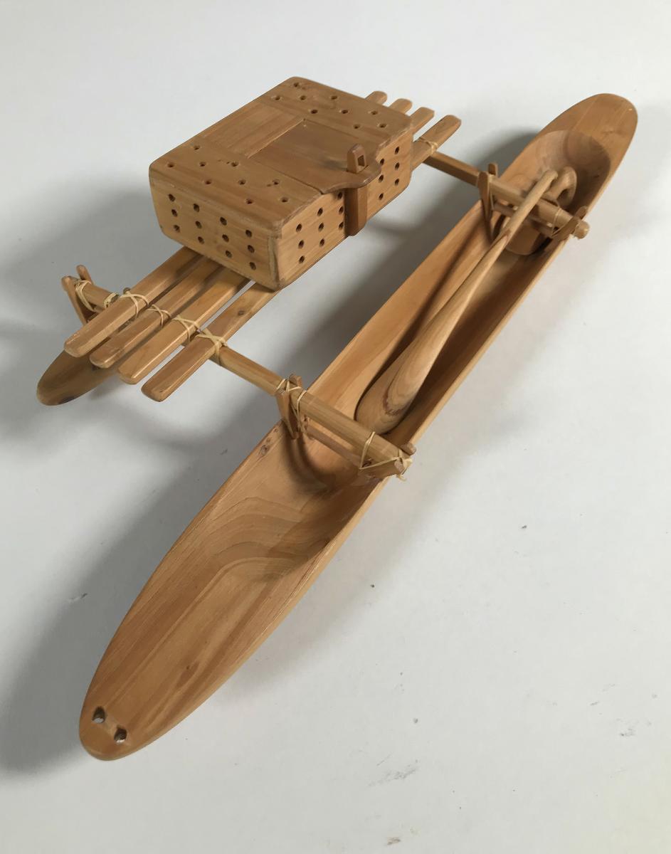 stockbåt,dubbelkanot bestående av två skrov förenade med fastsurrade balkar på vilken en plattform placerats.Flera tillhörande delar, en åra, ett öskar samt en förvaringslåda.