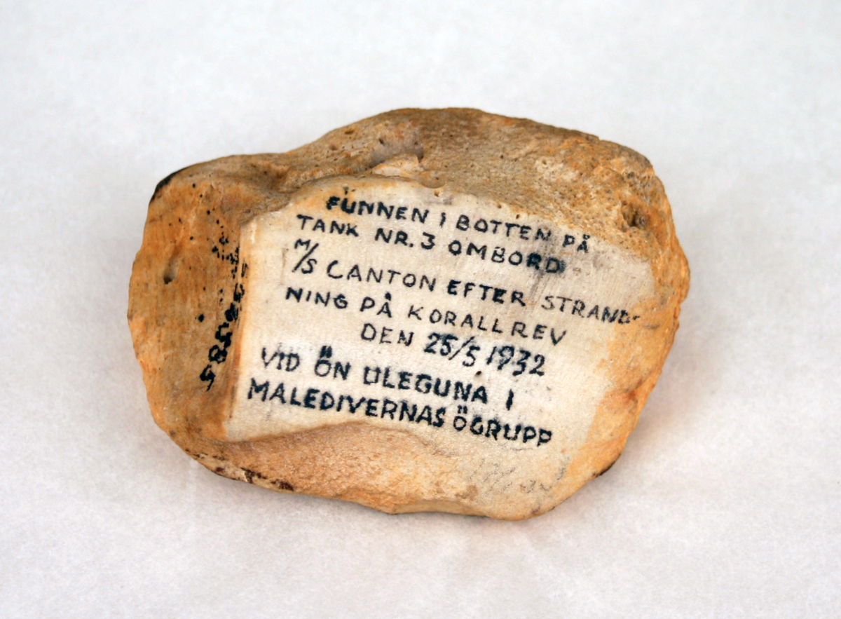 Påskrift: Funnen i botten på tank nr 3 ombord m/s CANTON efter strandning på korallrev den 25/5 1932 vid ön Uleguna i Maldivernas ögrupp