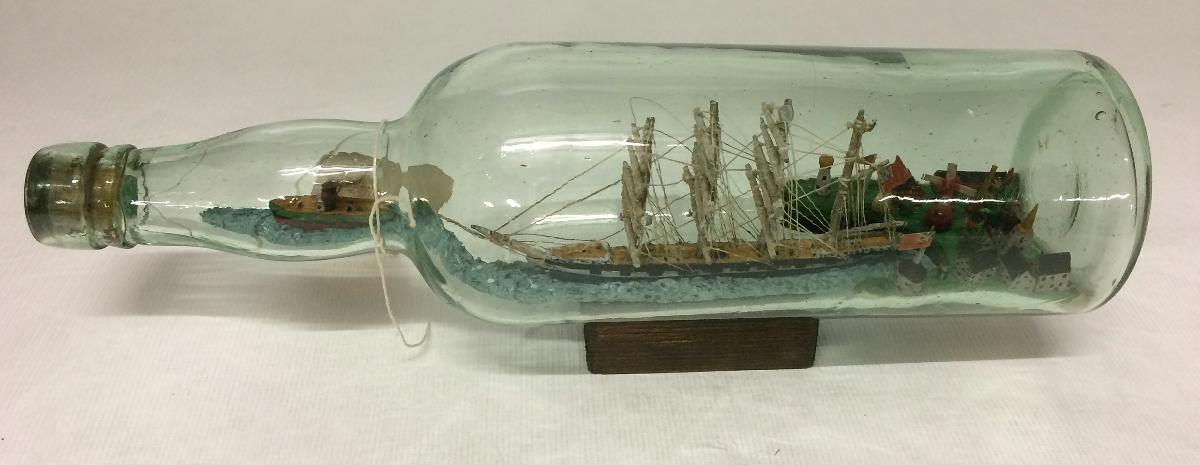 Flaskskepp som avbildar skeppet AURORA som bogseras ut ur hamn av bogserbåten BORE som är placerad i flaskans hals.