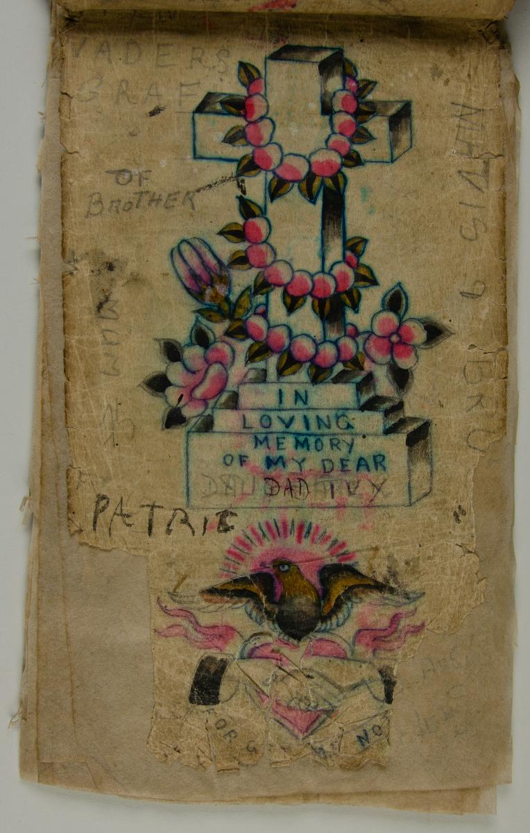 Bok med röda pärmar, innehållet flortunna papper med tatueringsförlagor. Förlagorna föreställer olika motiv, bland annat japanska geishor och traditionella sjömansmotiv. Boken köptes av givaren i en tatueringsstudio i Colombo på Sri Lanka 1960.