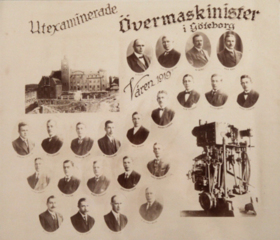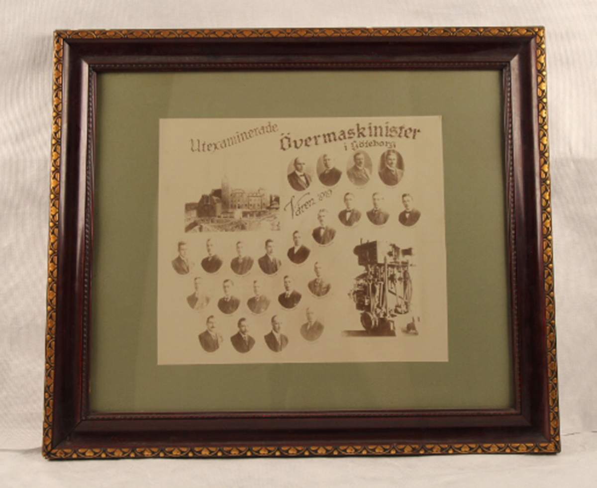 Inramat fotomontage föreställande 22 utexaminerade övermaskinister i Göteborg 1919.