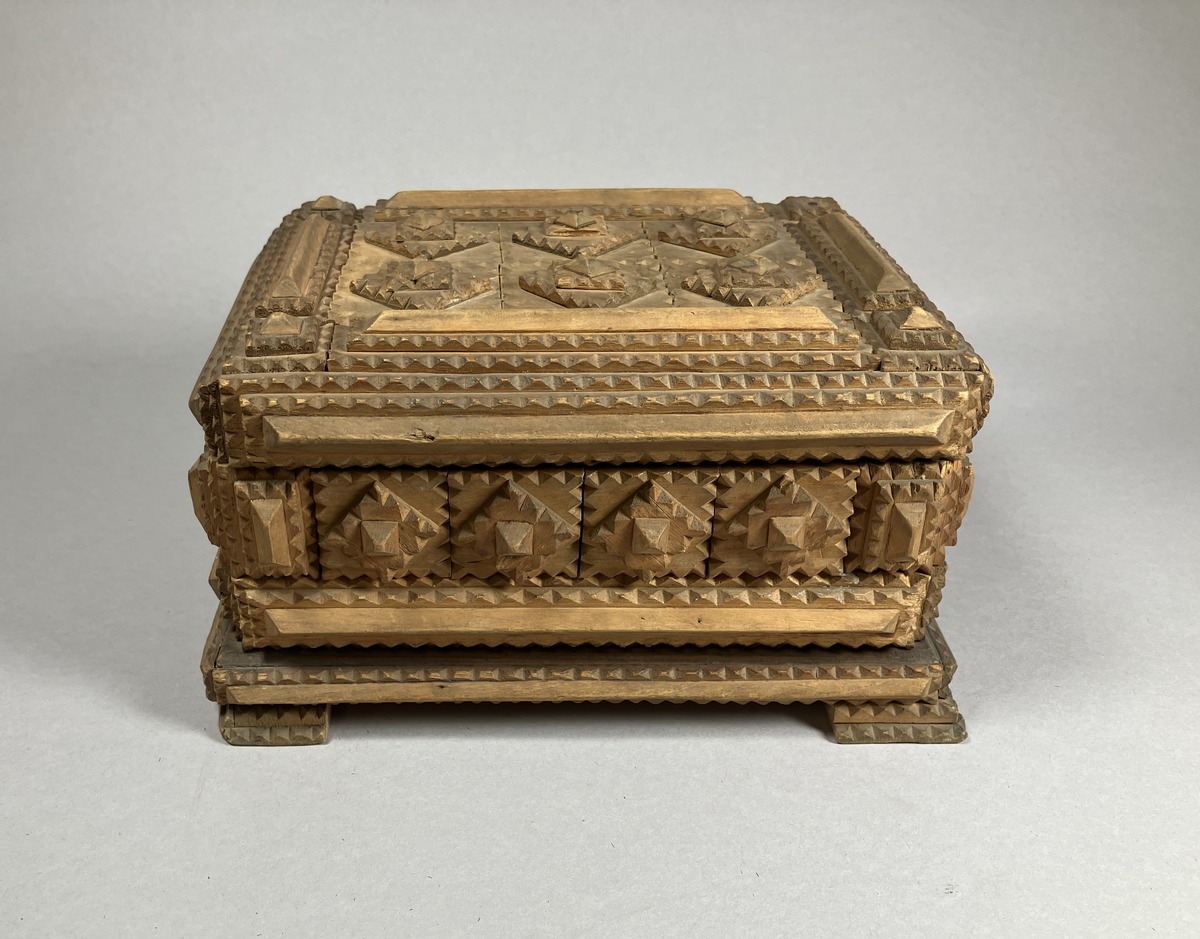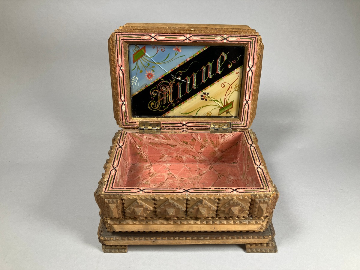Gå tillbaka till sökLägg till i Min samlingKopiera länkSkriv utSnidat diamantskrinAktörerGustav Gustavsson, Förvärvat frånKategoriskrin (Inredning) SjömansminneMaterial och teknikträ, spegelglasInventarienummerSMG33116UtställdInte utställd på museetBeskrivningSnidat skrin ett så kallat diamantskrin