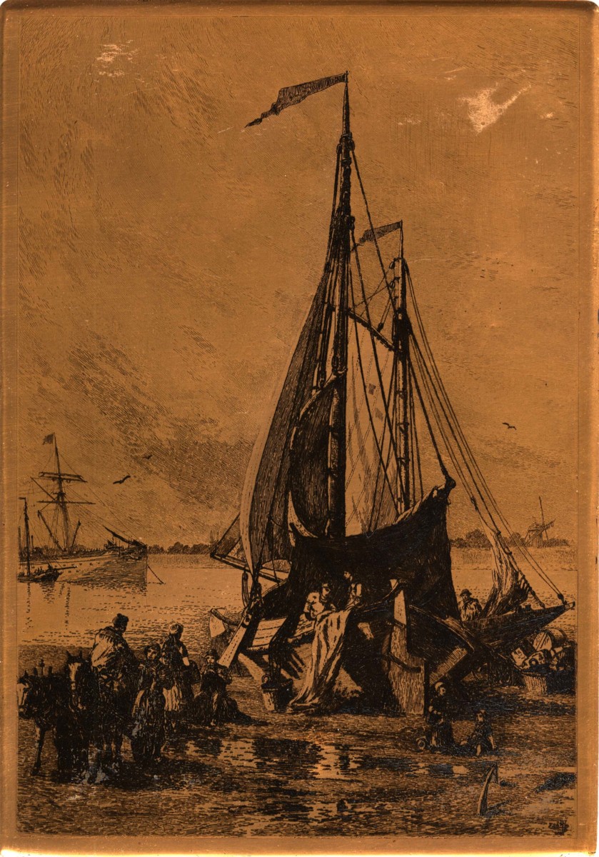 Etsplåt till grafik holländska musselbåtar på land under ebbtid