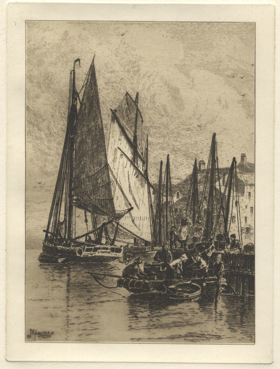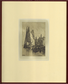 Etsning föreställande svenska bankfiskebåtar i hamn