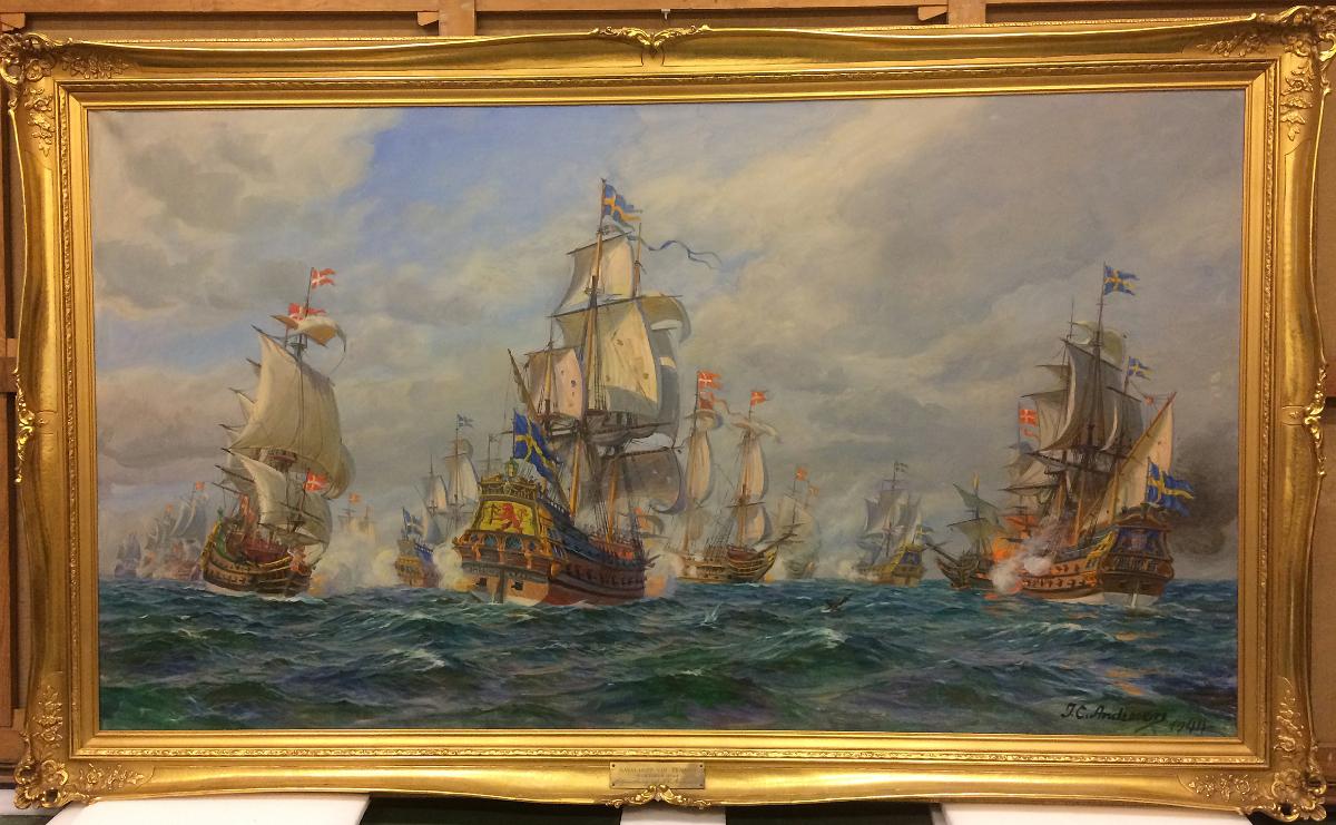 Gå tillbaka till sökLägg till i Min samlingKopiera länkSkriv utOljemålning, Sjöslaget vid Femern 1644AktörerJens Christian Andresen (1865 - 1949), KonstnärKategoriSjöslag och landstigningar (Konst)DateringFöreställande tid 1644Material och tekniklinneduk, oljaMärkningSignatur: J.C. AndresenDimensionerGrundmått 150,00 x 260,00 cmInventarienummerSMG33695UtställdInte utställd på museet
