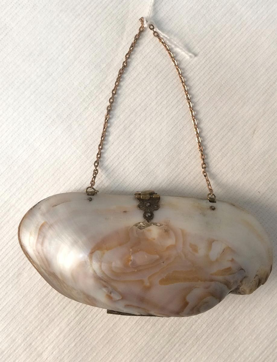 Börs med metallspänne och handkedja. Gjord av en hel snäcka.